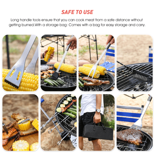 Designed for comfort and efficiency, each tool features an ergonomic, heat-resistant handle to keep your hands protected while cooking. The multi-functional spatula with a built-in bottle opener, heavy-duty tongs, meat fork, basting brush, grill cleaning brush, skewers, and corn holders make every grilling task easier. All pieces neatly store in a durable carry case, making transport, storage, and organisation a breeze. Elevate your braai experience with this complete, versatile, and portable grilling solution.